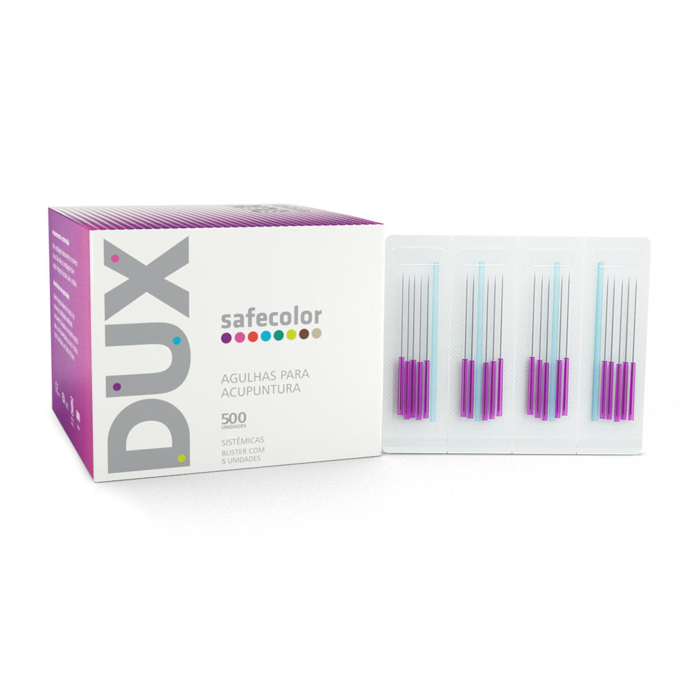As agulhas sistêmicas Safecolor da DUX vêm em caixas com 500 unidades, dispostas em um blister moderno de pvc rígido com 5 unidades e 1 tubo aplicador. Possuem cabo plástico colorido para fácil identificação do tamanho e segurança na retirada do paciente. Os cabos são fabricados em polipropileno extremamente leve, ecológico e hipoalergênico.